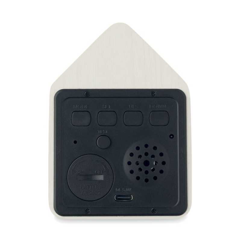 Malé stolní hodiny z MDF s budíkem a hlasem kukačky. Včetně ukazatele teploty. Bílý LED displej . Zvuk se automaticky ztlumí mezi 22:00 a 6:00.