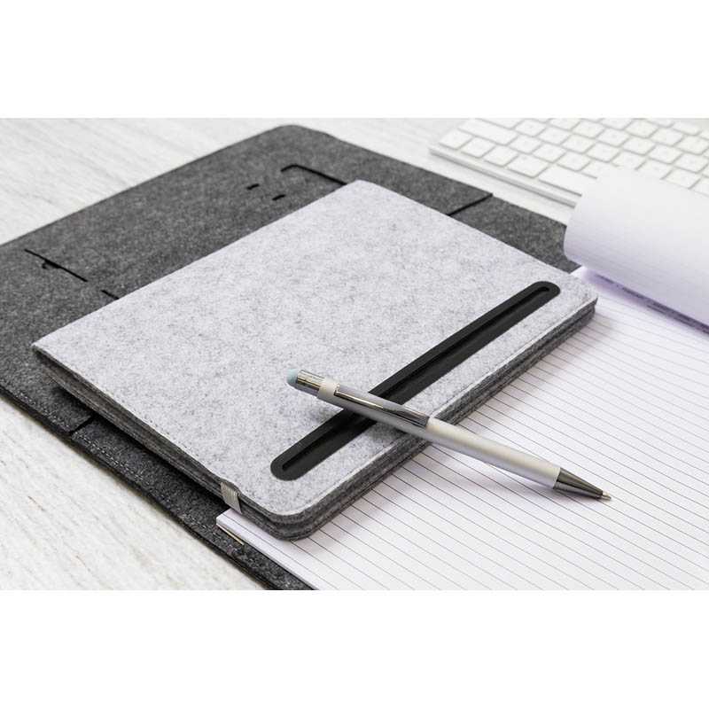 NOVINKA 2025. Plstěná sloha A4 na dokumenty z RPET s předními a několika vnitřními kapsami s organizérem. S 20 linkovanými listy poznámkového bloku z recyklovaného papíru.