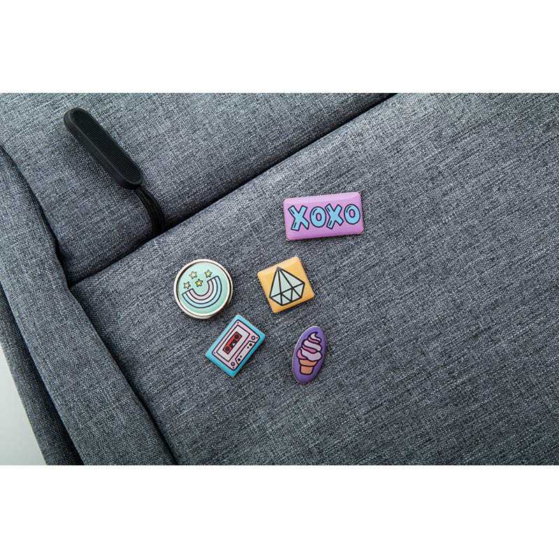 NOVINKA 2025. Original pin with LED light and powered by a button cell battery -included-. Using the button at the back of the item, the light can be set to three positions (steady light and fast/slow flashing light). With safety pin for fastening and presented in an individual kraft design box.