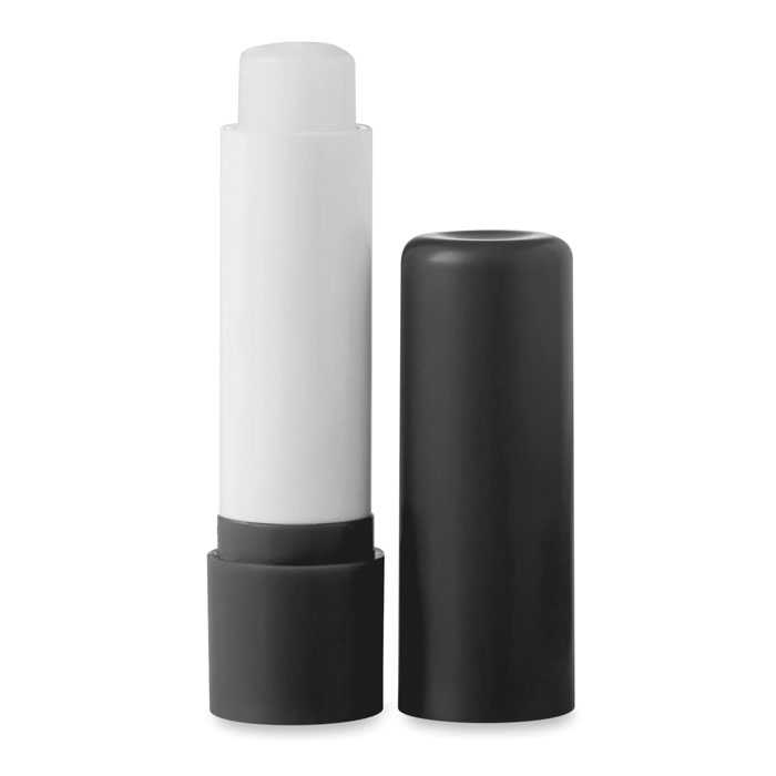 Lip balm with SPF15 protection, in transparent container. The colours white, silver and black have a matt finish.