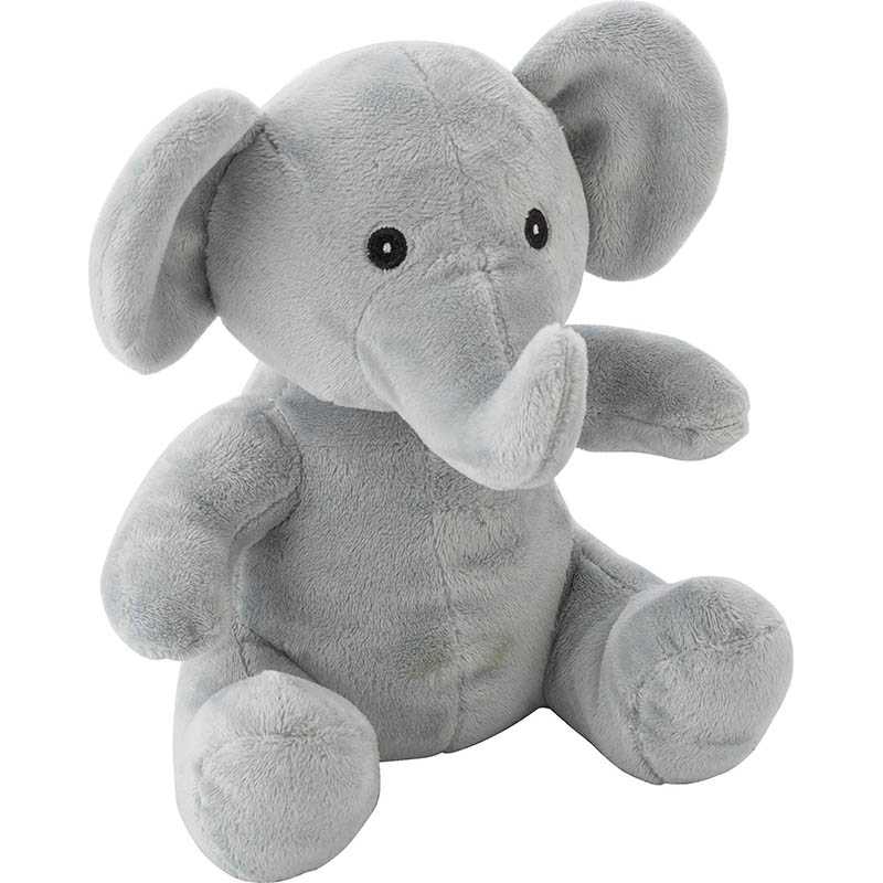 Plush elephant with embroidered eyes, nose, and mouth. Includes a tag for printing.