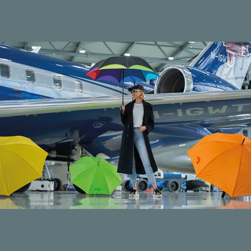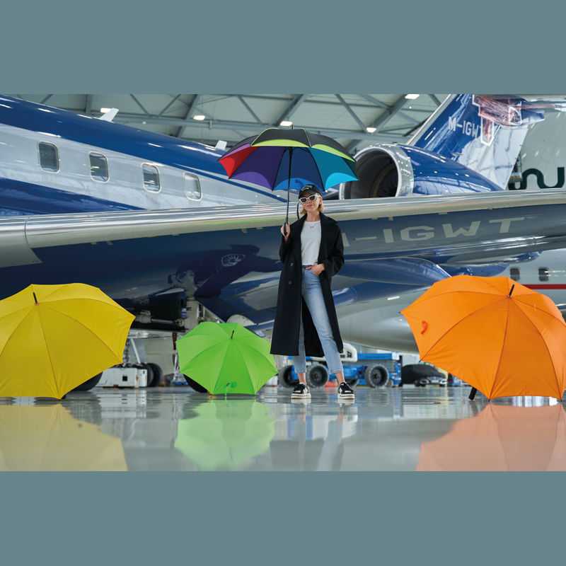 Conventient automatic function for quick opening, high-quality Windproof PLUS system for maximum frame flexibility in stormy conditions, flexible fibreglass ribs, soft crook handle with integrated push-button, higher corrosion protection due to galvanized steel shaft, large, accommodating diameter