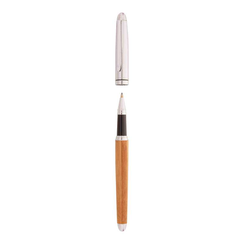 NOVINKA 2025. Nature line ball pen and roller set. Made in a combination of bamboo and metal to promote the use of natural raw materials and reduce pollutant emissions. Ball pen with twist mechanism in blue ink. Roller with cap, gel ink in blue and jumbo refill. Presented in an individual bamboo case.