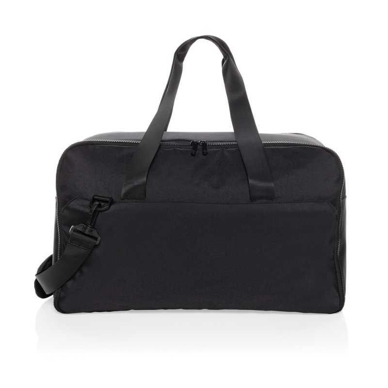 Velká sportovní nebo cestovní taška z polyesteru 300D RPET. Hlavní prostor s bočními přihrádkami na zip. Odnímatelná vyztužená spodní část a nastavitelný a odnímatelný ramenní popruh.