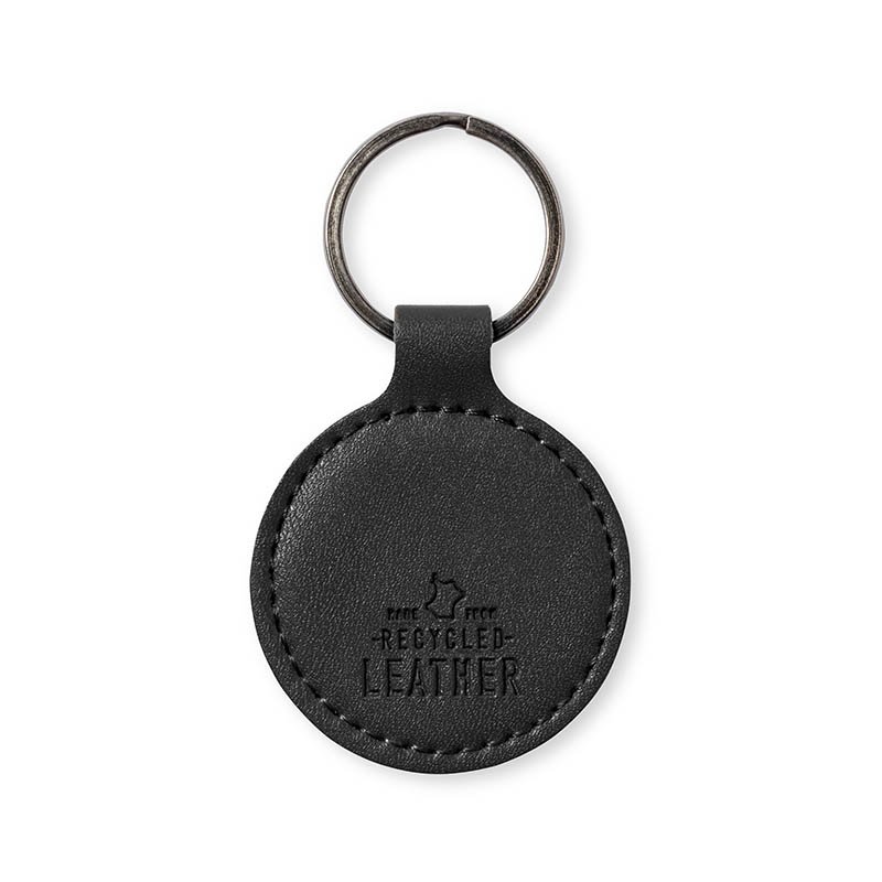 NOVINKA 2025. Nature line keyring made of recycled leather. In brown tone, with circular design and stitched finish. Engraved with the recycled leather logo on one side and with blank opposite side for branding. Chromed metal ring and presented in an individual kraft bag.Recycled leather recovers the fibers discarded in the manufacturing processes of leather, minimizing the waste of material, contributing to reduce the environmental impact, and preserving at the same time the original features of the leather.