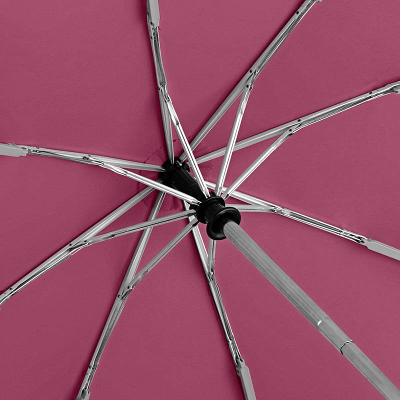 Convenient automatic open/close function for quick opening and closing, high-quality Windproof PLUS system for maximum frame flexibility in stormy conditions, depending on the colour, also available with waterSAVE® label on the closing strap (with new deliveries), chromed steel shaft, Soft-Touch handle in colour matching cover with silver push-button, elastic loop and promotional labelling option, sleeve with black piping. Also available as another mini pocket umbrella (art. 5565), as regular umbrella (art. 7560) and golf umbrella (art. 7580).