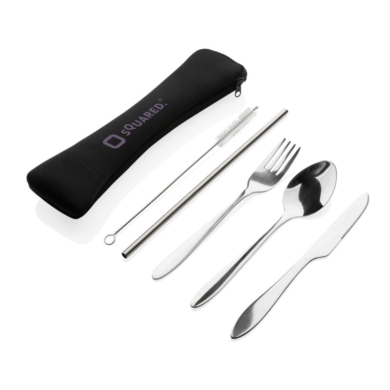 Opakovaně použitelná sada příboru z nerezavějící oceli. Ideální kamkoliv na cesty, do práce nebo do školy. Sada obsahuje: vidličku, nůž, lžíci, brčko a čistící kartáč na brčko. Včetně neoprenového pouzdra na zip a zapínání pro snadný přenos.