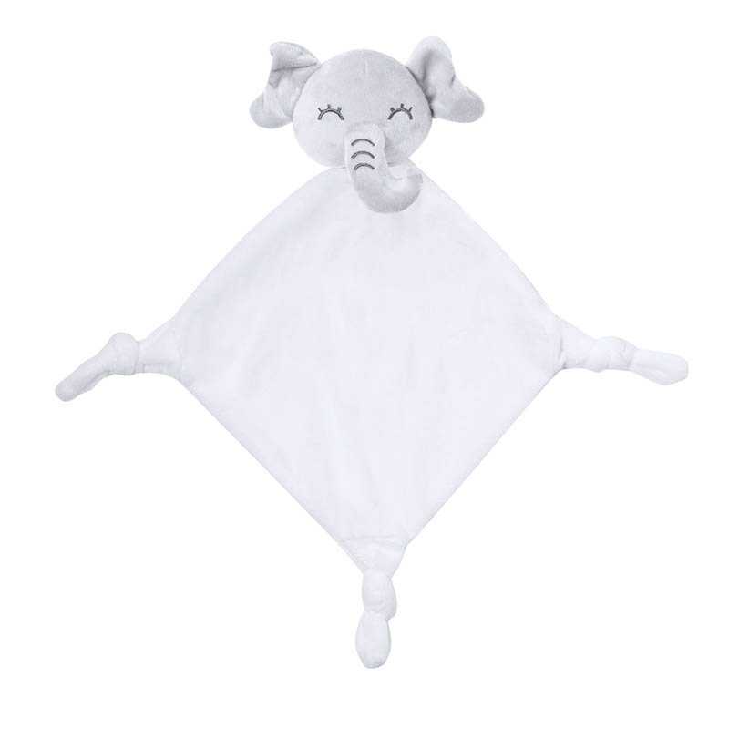 NOVINKA 2025. Tender doudou with cute white elephant design. With knots in each of the 3 corners to stimulate the baby's touch, favouring relaxation. Made from a single piece of fabric to avoid splitting into smaller pieces.