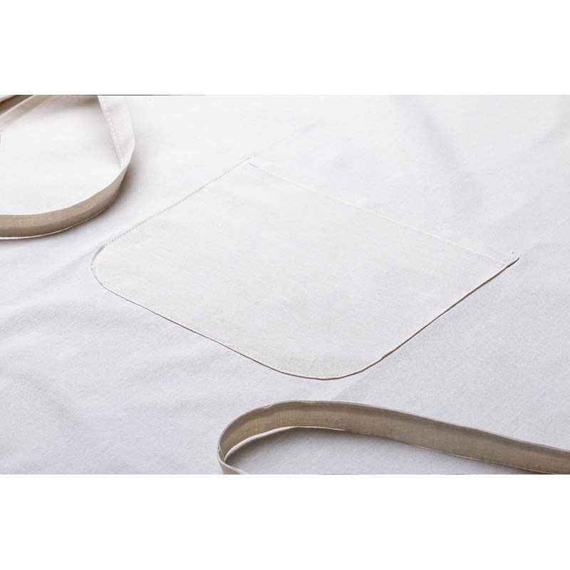 NOVINKA 2025. Nature line apron, made of cotton 180g/m2 in a natural tone. With Fairtrade certification, an alternative to the conventional trade system that pursues the development of peoples and the fight against poverty. With front pocket and drawstring, fitting below the knee. Including Fairtrade label and hangtag in recycled cardboard.
