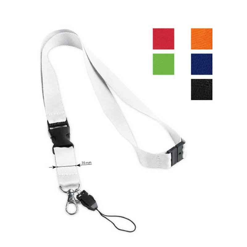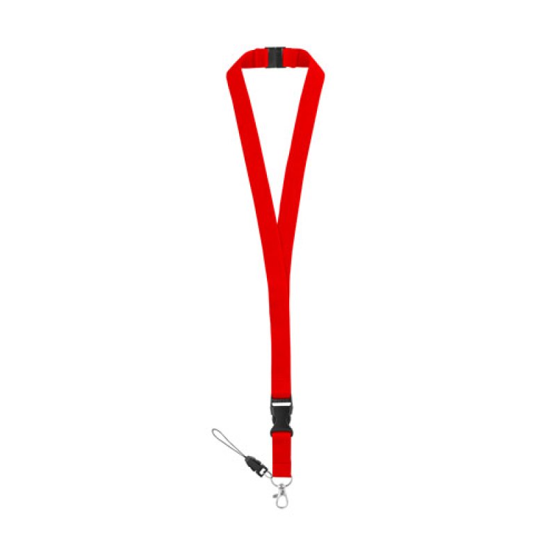 Polyesterová šňůrka s kovovou karabinou, odnímatelnou přezkou, popruhem na mobilní telefon a bezpečnostním zámkem. 20 x 510 mm