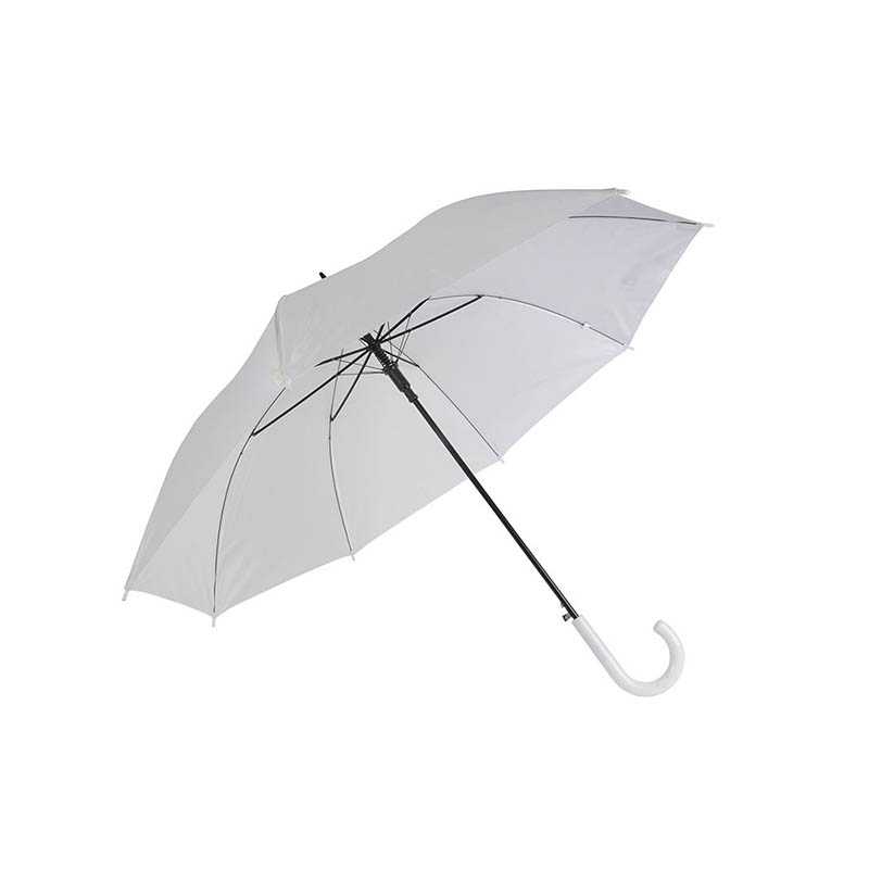 Polyester (190T) automatic umbrella with eight panels. Metal frame and wooden shaft and handle.