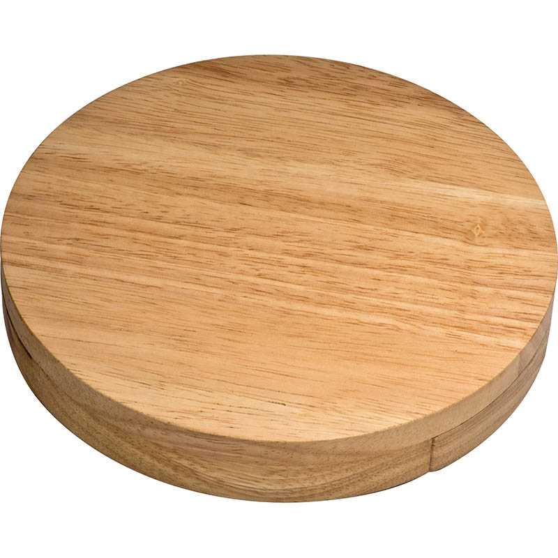 Dřevěná sada na servírování syrů. Obsahuje desku na krájení, dva různé kráječe na sýr a vidličku. Odsunutím vrchní části jsou pomůcky jednoduše dostupné. Způsob potisku gravírování.