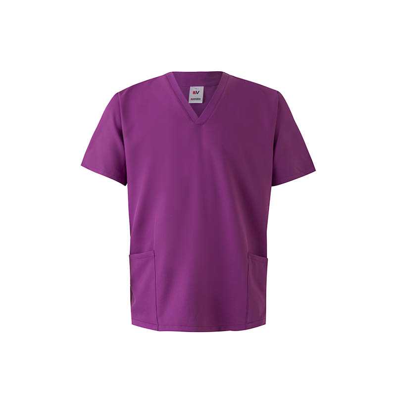 V-neck Side openings Liquid repellent and antibacterial fabric Three pockets: 2 lower patch pockets, one of them with an inner pocket