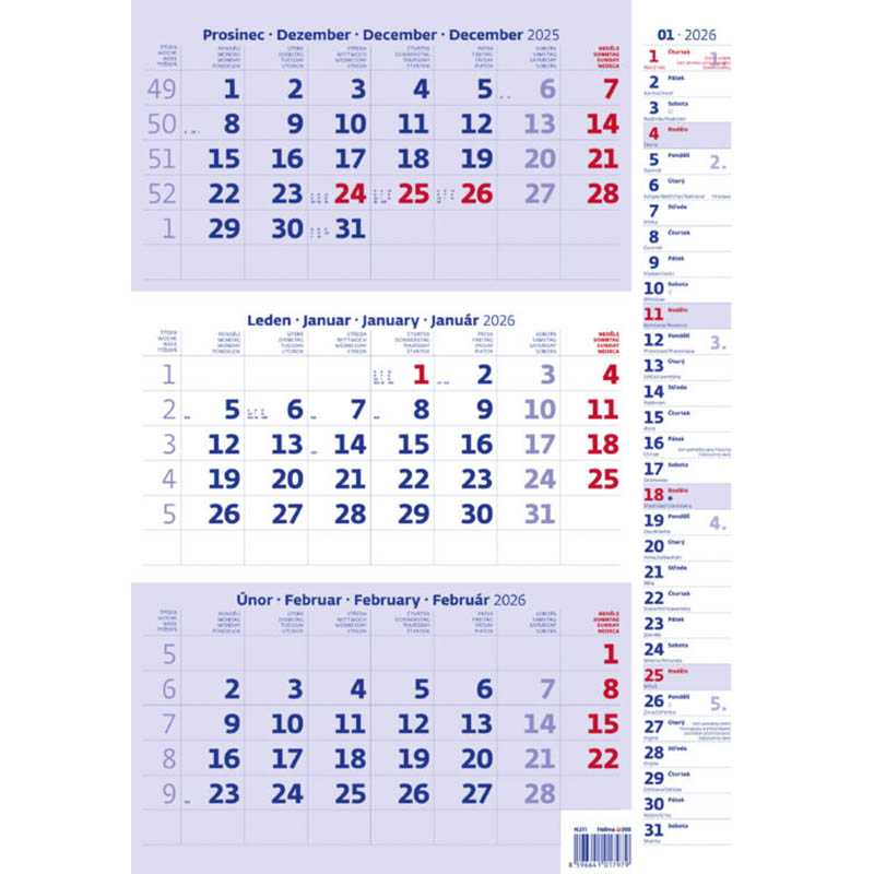 Formát kalendáře: 31,5 x 55,5 cm . Kalendárium: české tříměsíční jmenné + svátky vybraných evropských států (CZ / SK / A / B / D / F / H / CH / I / PL / RUS / UKR) . Rozsah kalendáře: 3 x 12 listů . Prostor pro přítisk: 31,5 x 3,5 cm . Složený kalendář: 3
