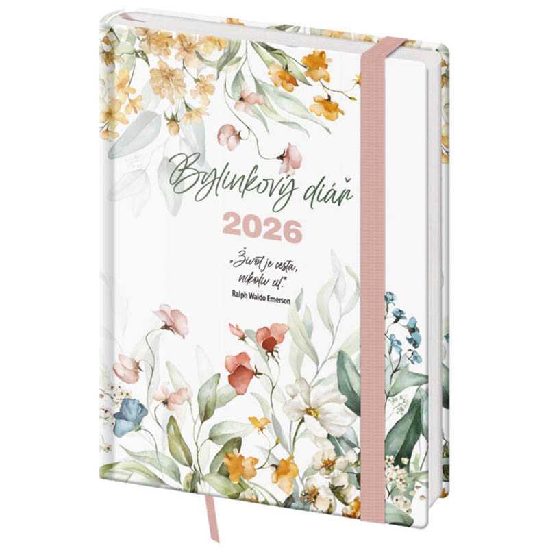 Týdenní diář B6 Bylinkový Flowers s gumičkou. Formát diáře: 125 x 176 mm. Rozsah diáře: 144 stran. Kalendárium: české týdenní. + 3x kreativní samolepky
