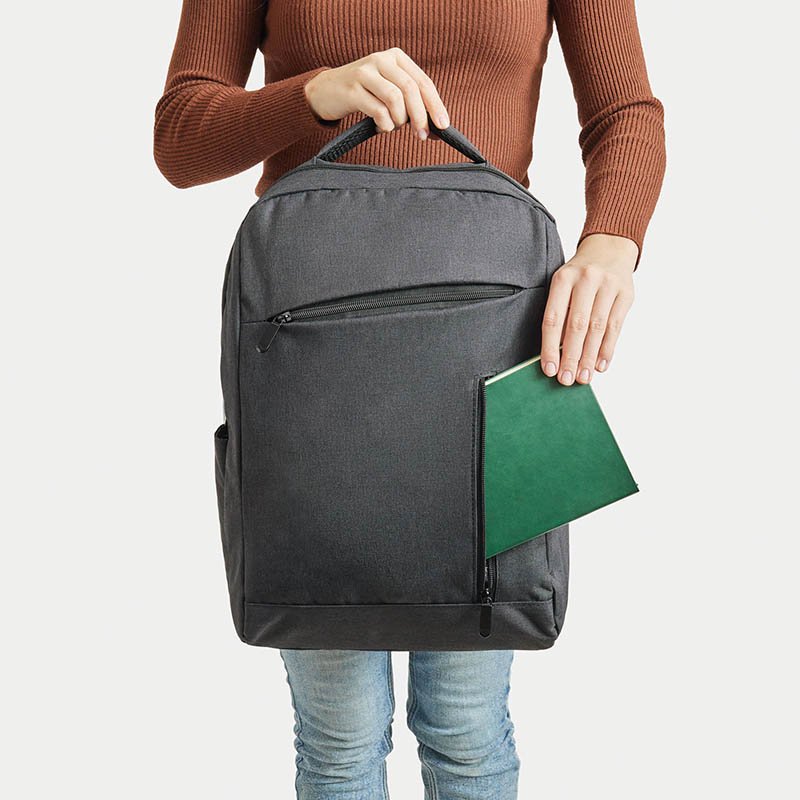Batoh na notebook 300D rPET a 600D rPET s reflexními prvky. Má 1 hlavní přihrádku s 1 multifunkční kapsou a kapsu na notebook až do velikosti 15.6". Obsahuje 1 přední kapsu na zip, 2 boční síťované kapsy a gumičku na přední straně pro přenášení různých předmětů. Rukojeti a zadní strana jsou polstrované. Kapacita je až 18 l. 320 x 450 x 140 mm
