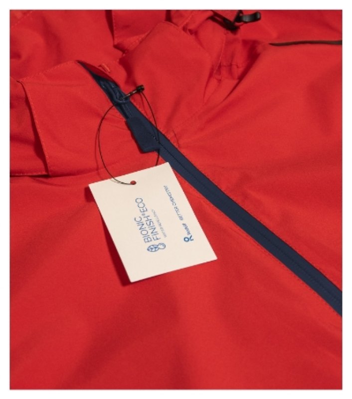 ľahký vodeodolný materiál s membránou, úprava BIONIC FINISH® ECO zabraňujúca prieniku vody, strih tvarovaný bočnými dielmi, vodeodolný zips zakončený krytkou brady, snímateľná kapucňa na sťahovateľnú šnúrku, lemy rukávov nastaviteľné suchým zipsom, bočné