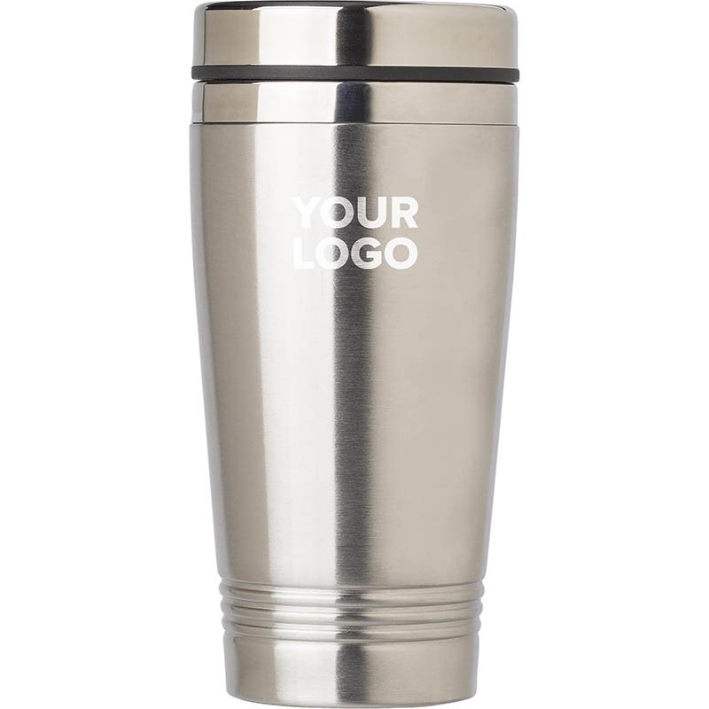 Stainless steel drinking mug (450 ml) with lid, double walled. Lid has a sliding opening for drinking. Anti-slip bottom. Individually packaged in a brown cardboard box.