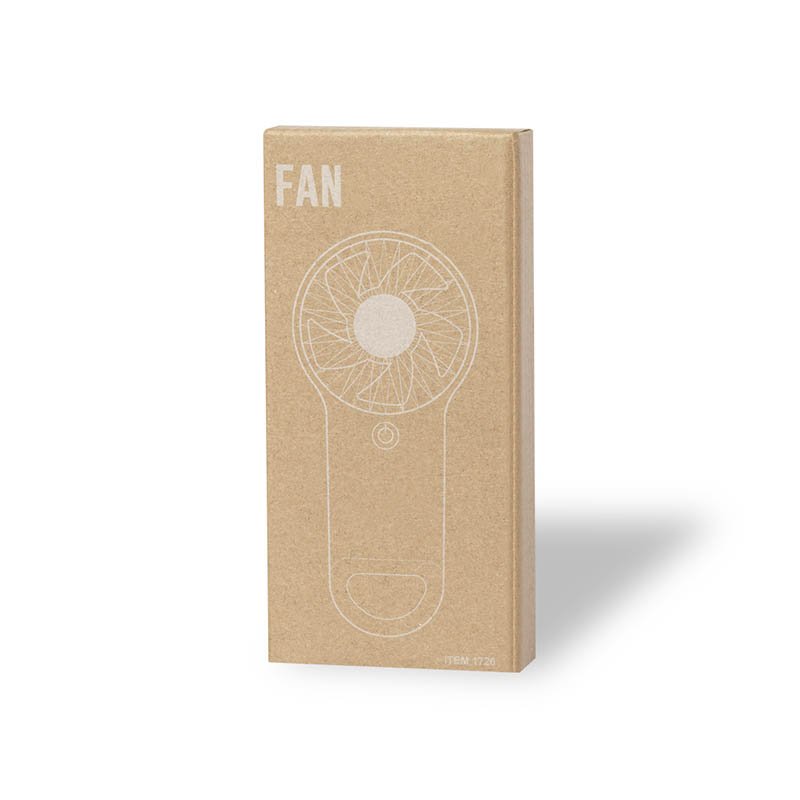 NOVINKA 2025. Fan made of resistant ABS in white colour, with integrated carabiner. With 2 operating speeds and presented in an individual box with kraft design. Battery powered (3xAAA not included).