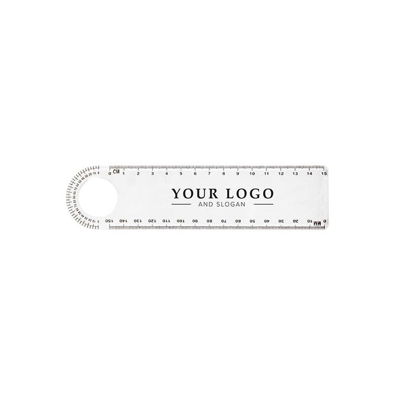 Plastic transparent ruler (15 cm) with magnifying glass and protractor.
