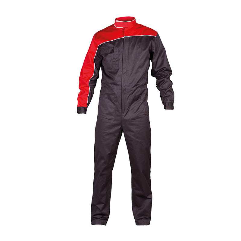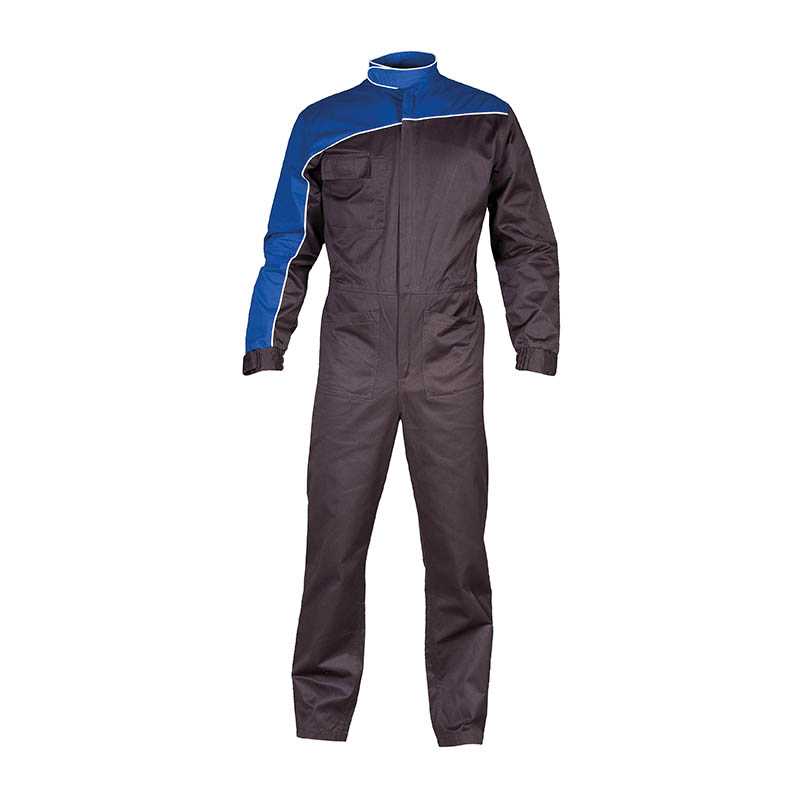 TWO-TONE OVERALL 65% polyester- 35% cotton - Covered full zip - Mandarin collar with velcro closure - Piping on collar, sleeve, chest and back - One chest pocket with double pen holder - Two opened pockets on front side - Elasticized fabric at waist on back side - Elasticized cuffs with velcro closure
