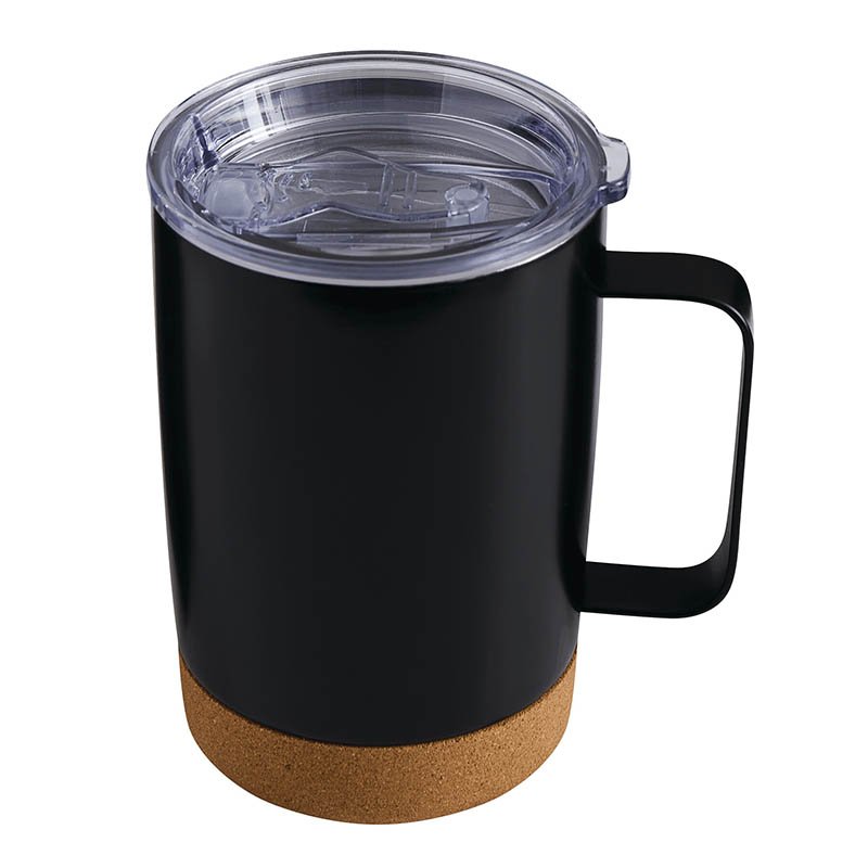 NOVINKA 2025 XMASS. Vacuum drink mug STEELJOURNEY, double-walled: inside and outside made of stainless steel, with cork bottom and practical handle, plastic lid with silicone sealing ring and integrated sliding drinking opening, capacity approx. 350 ml, k