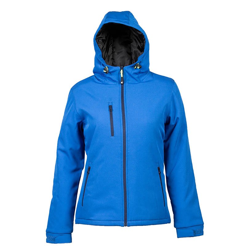 Softshell padded jacket 2 layers water resistance - 96% polyester – 4% elastan - Waterproof 6000mm/H2O - Polyester lining - Polyester padding - YKK zippers - Padded hood with drawstring - One chest pocket with zip - Two outside pockets with zip - Inner wallet pocket - Adjustable cuffs with velcro - Drawstring at the bottom