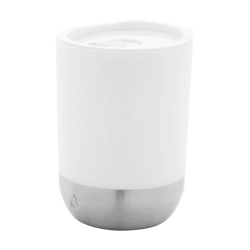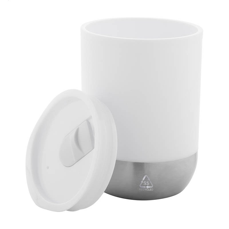NOVINKA 2025. Insulated Cup with a capacity of 290 ml. Made of strong, double wall Recycled PP, in combination with a Recycled Stainless Steel base. Eady opening lid with dispenser, BPA free. It is ideal for your desk, table, or any surface where you can enjoy your favorite drink. Food Grade certified, guaranteeing safety when food comes into contact with the material used to manufacture the product. With Recycled Stainless Steel logo. Recycled PP is a recycled and highly recyclable plastic, highly resistant and suitable for a multitude of applications.Steel is one of the most sought-after materials and can be found almost everywhere, from everyday products to large buildings. It has countless properties, including durability and a high degree of reusability, making it a highly valued alternative for sustainability solutions. Properly treated, it allows new resources of infinite use to be obtained.