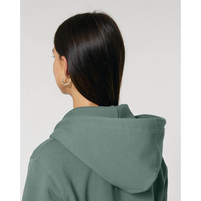 Set-in sleeve Lined hood in recycled sherpa Round drawcords in matching body colour with metal tipping Metal eyelets Inside herringbone back neck tape in greige colour Self fabric half moon at back neck Covered metal zip at center front 1x1 rib at sleeve