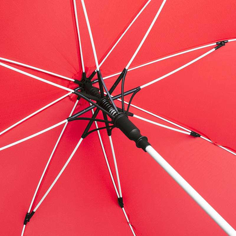 Easy to handle thanks to sliding safety runner, high-quality Windproof PLUS system for maximum frame flexibility in stormy conditions, flexible fibreglass ribs, lightweight aluminium shaft, special umbrella shape due to the 10 panels, black Soft-Touch crook handle with promotional labelling option