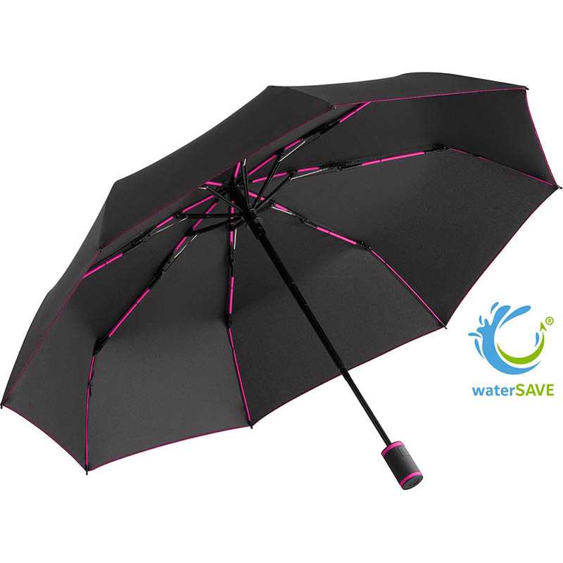 Convenient automatic open/close function for quick opening and closing, high-quality Windproof PLUS system for maximum frame flexibility in stormy conditions, flexible fibreglass ribs, polyester pongee material made of recycled plastics, eco-friendly thanks to original waterSAVE cover material made of recycled plastics, with waterSAVE® label on the closing strap (with new deliveries), attractive design thanks to coloured ribs, handle rings and seams, comfortable Soft-Feel handle with integrated push-button and promotional labelling option, convenient case with coloured seams and carrying straps. Also available as mini umbrella (art. 5084, 5584), midsize umbrella (art. 4784) and golf umbrella (art. 2384).