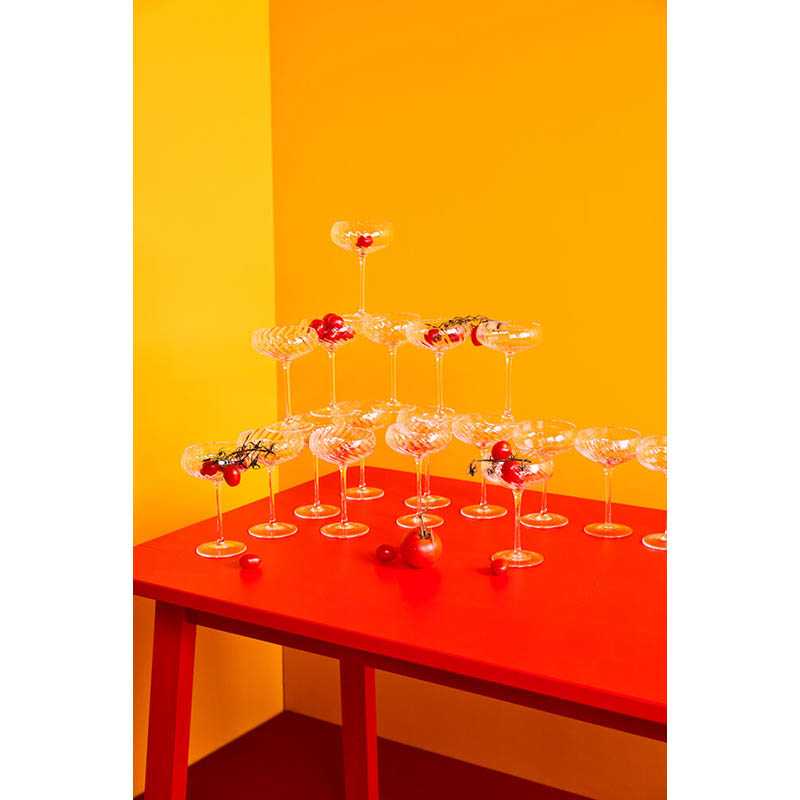 Opacity Champagne coupe is designed for the perfect experience - on the table, in the hand, and while drinking. It's a thin and delicate champagne coupe with a beautiful twisted glass pattern in clear glass. It also works wonderfully for desserts or morning juice, adding a festive touch. The design achieves a perfect contrast between luxury and boldness. Designed by Byon Studio. Delivered in a 2-pack in a Byon box. Material: glass Weight: 132 g Width: 110 mm; Height: 160 mm; Length: 110 mm; 30 cl Color: peach