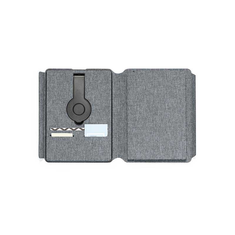 NOVINKA 2025. Multifunctional folder/notepad with magnetic closure, made of 300D RPET polyester, obtained from recycled plastic. Inner label with RPET logo.Including 10W multiposition wireless charger integrated in the cover, with magnetic attachment to use the device while charging and including adhesive ring.Suitable for all devices with Magsafe and Qi technology. Inside with wireless charger for smartwatch.Built-in battery with 5,000 mAh charging capacity, with Type-C input/output port and LED charging status indicators, cable included.Inside with smartphone holder and a multitude of card compartments, including pen holder and A5 notepad, with 64 sheets and single-stripe layout.Presented in an attractive individual design box.The capacities shown in all our external auxiliary batteries are real, all of them incorporating non-recycled, grade A batteries, with a service life of at least 500 charging cycles, and complying with CE regulations.??In addition, they are manufactured according RoHS standards, and in compliance with the following safety requirements:??Power bank overcharge protection system.?Complete discharge protection system, which increases the durability of the power bank.?Blocking system to prevent short circuits.?Constant charging transfer system, in accordance with the capacity of the target device.