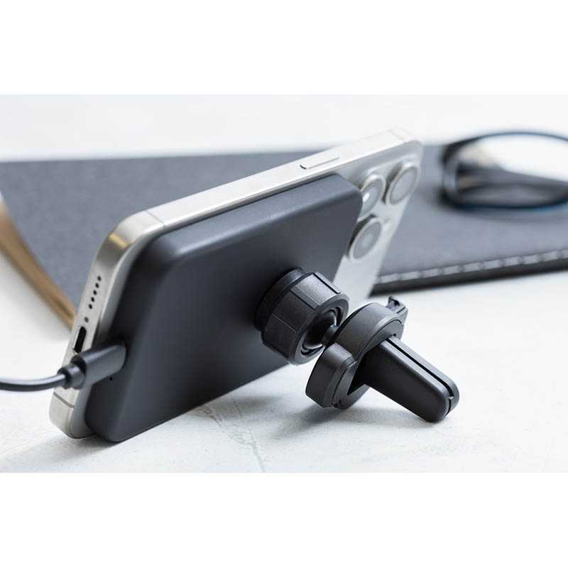 NOVINKA 2025. Magnetický držák na mobil do auta v recyklovaném ABS pouzdru s vestavěnou bezdrátovou rychlonabíječkou (15W) a nastavitelným upevněním do větracího otvoru. Včetně samolepícího kovového kroužku pro použití magnetické funkce na jakémkoli bezdr