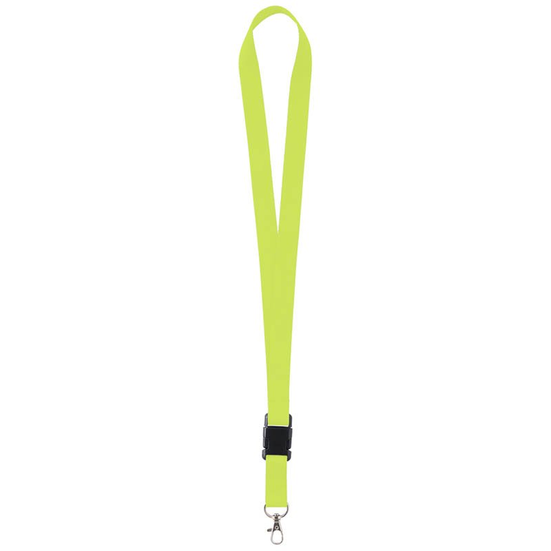 Polyester lanyard with plastic safety release clip and metal key holder.