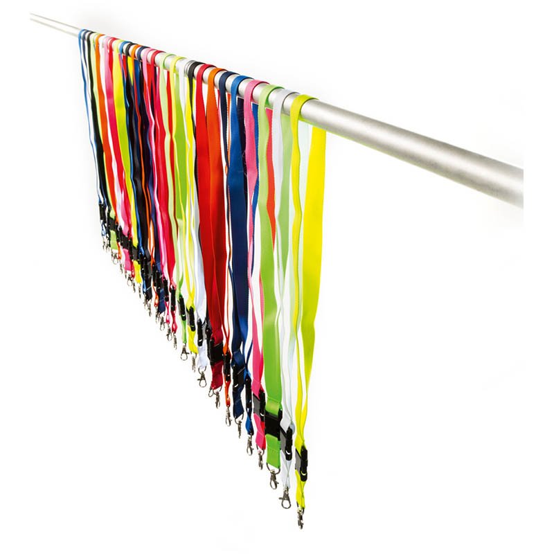 NOVINKA 2025. Lanyard in resistant and soft polyester string in a varied range of bright tones. With detachable snap closure on collar, metal carabiner accessory and central pad for printing.