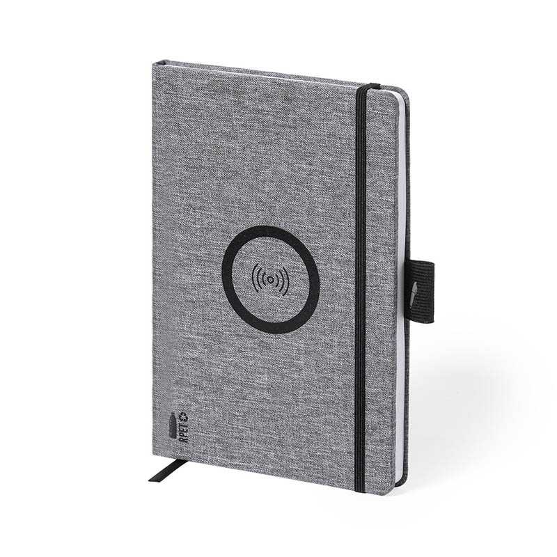 Zápisník A5 v pevnej väzbe z polyesteru RPET so zabudovanou bezdrôtovou nabíjačkou (15 W). USB kábel je súčasťou. Zápisník má 80 štvorčekových listov (70 g/m2).
