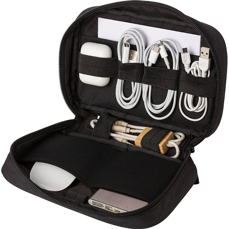 NOVINKA 2025. rPET 300D polyester travel pouch. One compartment with multiple pockets for carrying cables and travel documents. With Velcro-closing front pocket. Including rPET label.