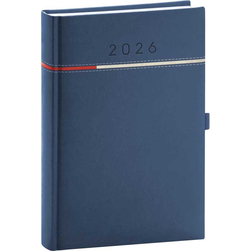 Denní diář Tomy 2026 v modro-červené barvě. Klasický povrch imitující kůži, který doplňuje jemné prošití. Na materiál lze tisknout a je vhodný pro všechny typy ražeb. Denní rozvrh s česko-slovenským kalendáriem a doplňkovou angličtinou, němčinou, maďaršti
