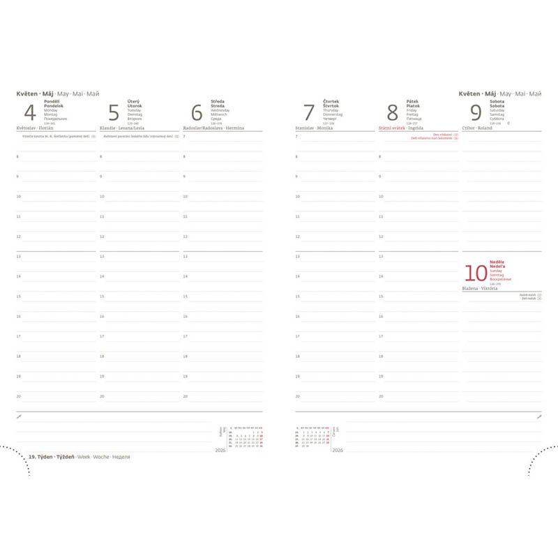 Nová řada diářů v moderním designu doplněném o pevnou gumičku a poutko na pero. Týdenní rozložení s česko-slovenským kalendáriem a doplňkovou angličtinou, němčinou, maďarštinou a ruštinou. • kalendárium od prosince 2025• měsíční plánovací kal