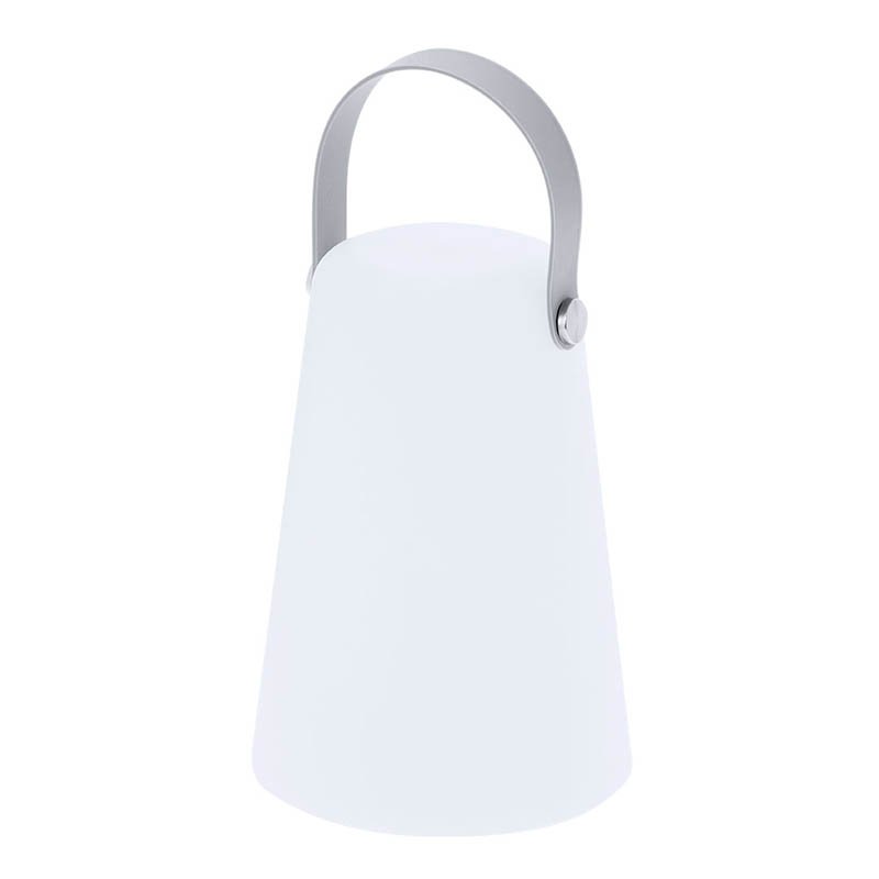 NOVINKA 2025. White PE lamp. Includes a soft grey silicone handle on top for easy transport and adds a modern touch to the design. Equipped with 4 LEDs, it provides uniform and efficient light for both indoors and outdoors. Operates with 3 AA batteries (not included). Has an on/off button.