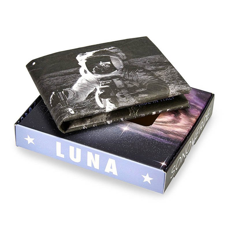 Tyvek ecological wallet. 100% Made in Italy. Size closed: 10x8 cm Open 10x20,5 cm. In gift box. Design "Luna" https://www.thegiftcollection.net/product_image/StopMotion/StopMotionSonoverde.mp4