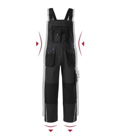 .Pracovní kalhoty v novém designu v klasické délce s laclem.Lehké a pohodlné díky přidanému elastanu.Ergonomický střih, elastický pas s poutky na opasek.Kapsy: několik kapes na nářadí, kapsa na metr.Poutko na tužku a kapsa na mobil, kapsa na laclu.Nastavi