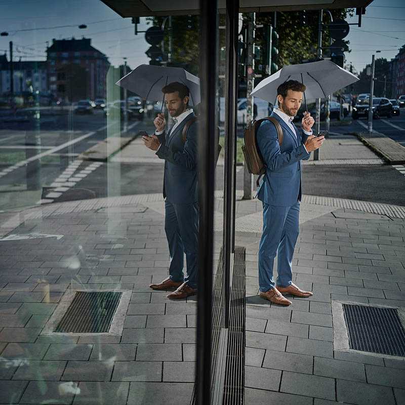 Easy to handle thanks to sliding safety runner, high-quality Windproof PLUS system for maximum frame flexibility in stormy conditions, plastic handle with carrying loop made of cover material colour-coordinated with the cover, special handle with silicone ring to ensure tight closing of the package, tube made of plastic with rubber lip for draining water and for the safe transport of the wet umbrella