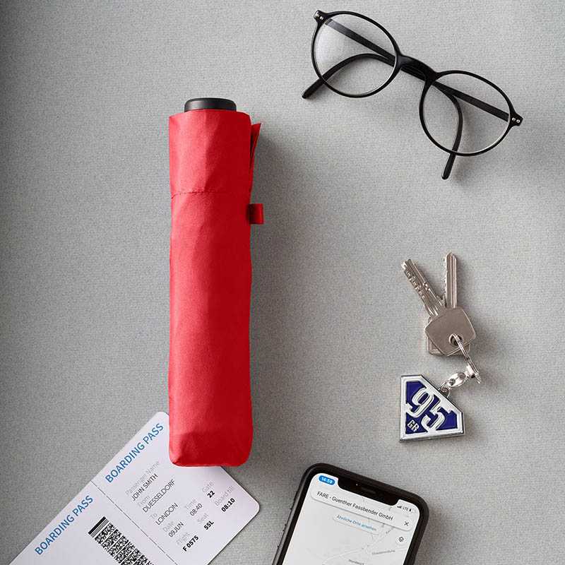 Easy to handle thanks to sliding safety runner, high-quality Windproof PLUS system for maximum frame flexibility in stormy conditions, black aluminium shaft, polyester pongee cover material made of recycled plastics, extra lightweight cover, dull black plastic handle with promotional labelling option, suitable for handbag through ultra-light weight and compact size