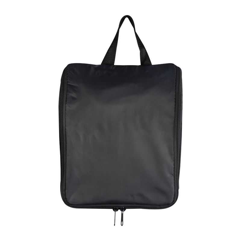 HANG-UP toaletní taštička v černé barvě, s malým poutkem na zavěšení. Vyrobená z polyesterové nepromokavé látky, lehce se čistí. Způsob potisku sítotisk.