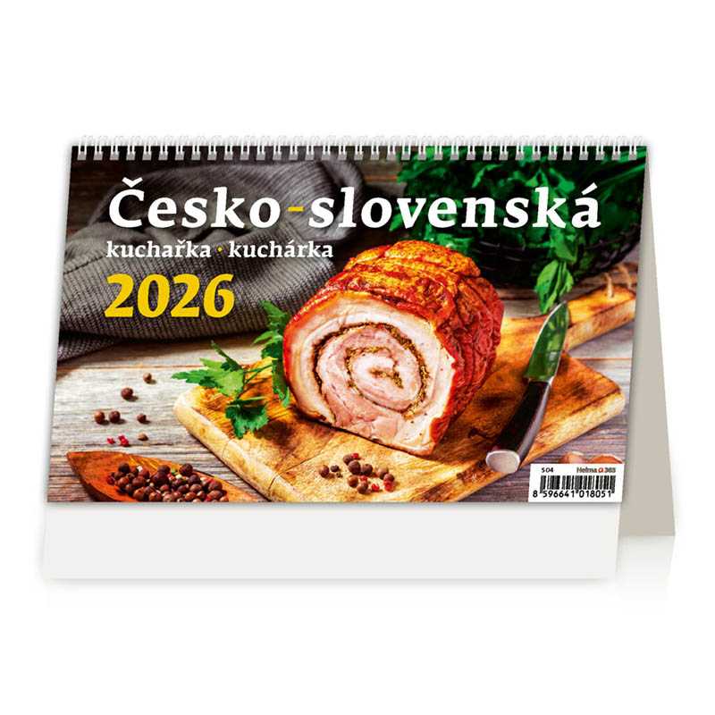 Kalendář Česko-slovenská kuchařka. Formát kalendáře: 22,6 x 13,9 cm. Kalendárium: české/slovenské týdenní řádkové. Počet stran kalendáře: 58 + 2. Stojánek: se zámkem. Prostor pro přítisk: 22,6 x 3 cm. Česko-slovenské recepty a kalendárium