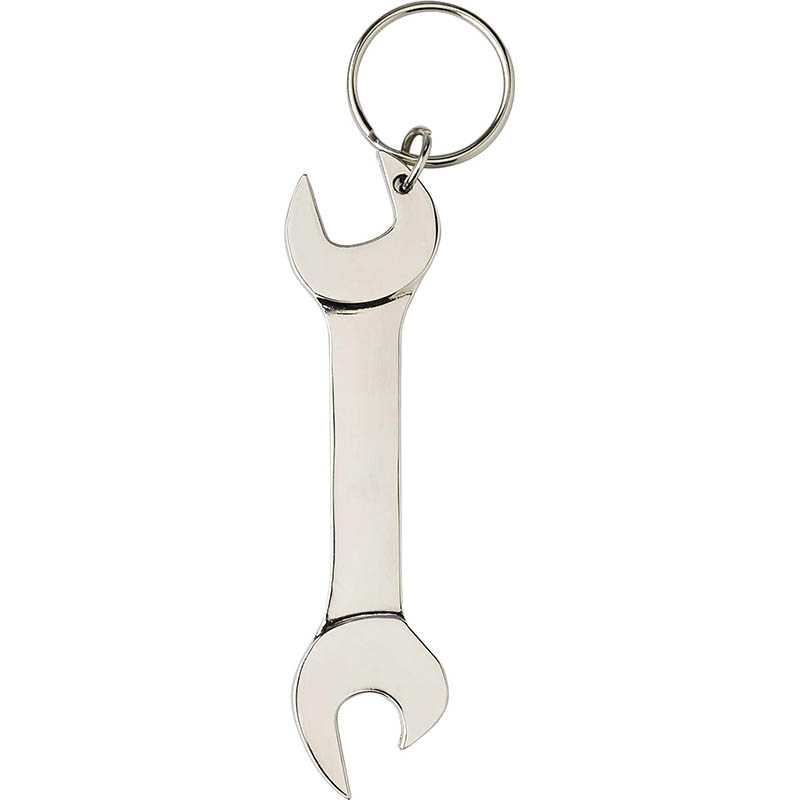 Metal keychain. Shape of wrench, bottle opener function.