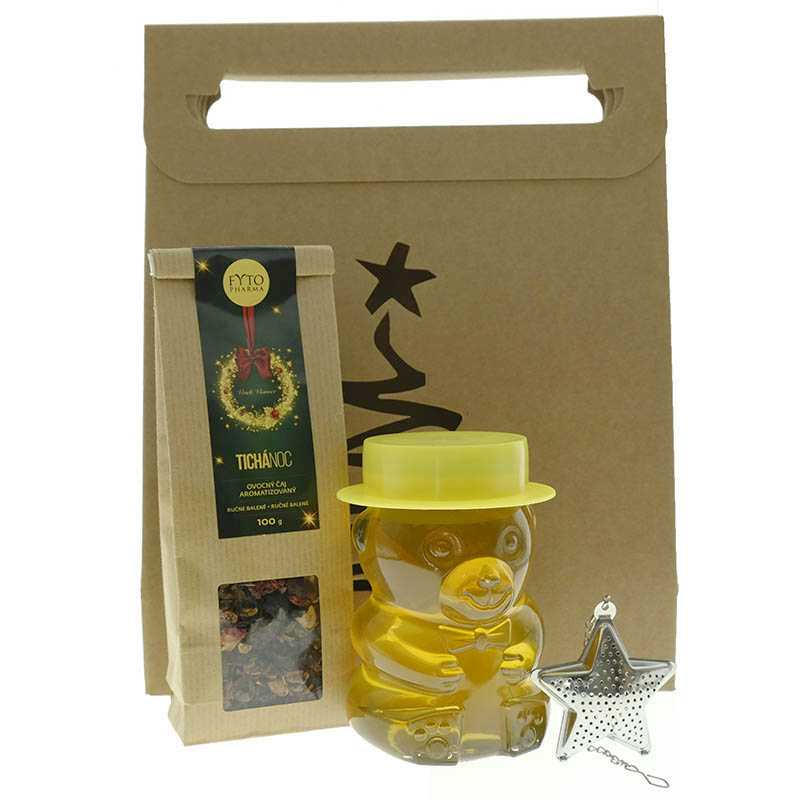 Tichá noc 100 g sypaná ovocná zmes, Med kvetový 400g - v sklenenej fľaši macka, čajítko. Darčeková taška 30x23x10 cm