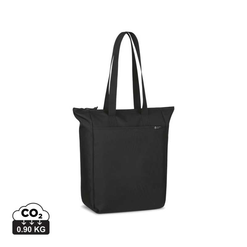 městská nákupní taška s hlavním oddílem se zavíráním na zip; svrchní materiál rPET; polstrované dno; přední kapsa na zip; dvě držadla